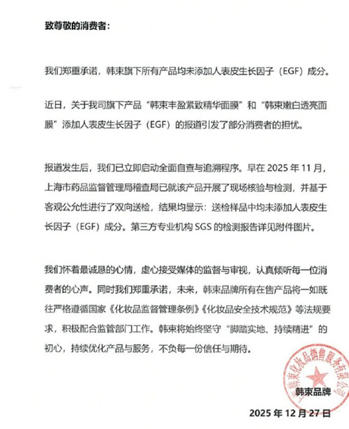 12月27日,@韓束KANS發(fā)文稱,“報(bào)道發(fā)生后,我們已立即啟動(dòng)全面自查與追溯程序。早在2025年11月,上海市藥品監(jiān)督管理局稽查局已就該產(chǎn)品開展了現(xiàn)場(chǎng)核驗(yàn)與檢測(cè),并基于客觀公允性進(jìn)行了雙向送檢,結(jié)果均顯示送檢樣品中均未添加人表皮生長(zhǎng)因子(EGF)成分。”