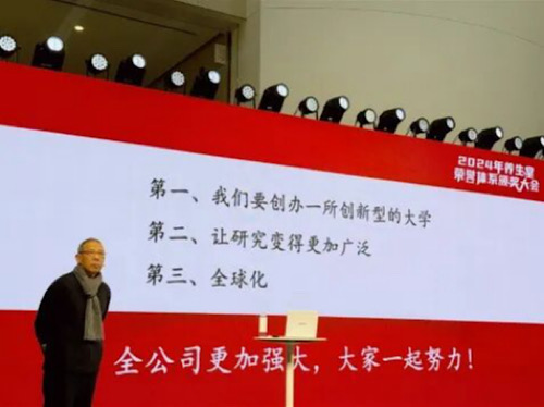 2025年1月22日,農(nóng)夫山泉母公司養(yǎng)生堂集團(tuán)舉辦年會,農(nóng)夫山泉創(chuàng)始人鐘睒睒出席并發(fā)表演講。會上,鐘睒睒首次透露要創(chuàng)辦一所創(chuàng)新型的大學(xué),并計劃未來10年捐贈400億元。圖片來源:新華網(wǎng)