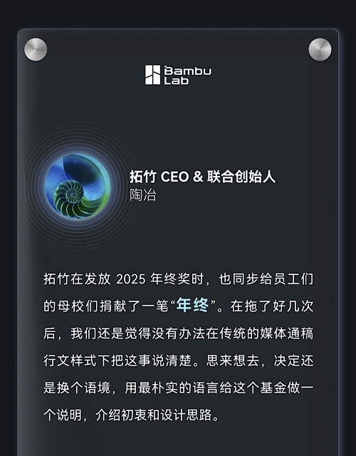 陶冶表示,給母校捐一筆錢大概是2025年中時(shí)定下的,當(dāng)時(shí)拓竹年?duì)I收破百億的預(yù)期已經(jīng)比較明朗了,創(chuàng)始人團(tuán)隊(duì)覺得公司到了有能力回饋母校的階段了。“公司過去五年的發(fā)展,幾乎可以百分百歸功于廣大員工。拓竹的業(yè)務(wù)決定了我們無法依靠少數(shù)幾個(gè)‘英雄人物’去搞定特定技術(shù)點(diǎn)、投資人、關(guān)鍵大客戶等等。”