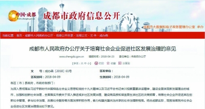 四川省成都市政府近日在其官網(wǎng)公布了《關(guān)于培育社會(huì)企業(yè)促進(jìn)社區(qū)發(fā)展治理的意見》(簡(jiǎn)稱《意見》),引起廣泛關(guān)注。