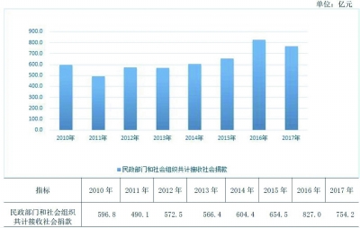 近日,民政部發(fā)布了《2017 年社會服務(wù)發(fā)展統(tǒng)計(jì)公報(bào)》。統(tǒng)計(jì)公報(bào)顯示,全年共接收社會捐款754.2億元,其中:民政部門直接接收社會各界捐款25.0億元,各類社會組織接收捐款729.2億元。