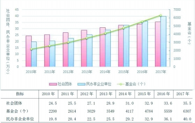 截至2017年底,全國共有社會組織76.2萬個(gè),比上年增長8.4%;吸納社會各類人員就業(yè)864.7萬人,比上年增長13.2%。全年共查處社會組織違法違規(guī)案件4293起,行政處罰4270起。