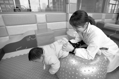 3月1日,在湖南中醫(yī)藥大學(xué)第一附屬醫(yī)院,康復(fù)治療師楊艷(右)在協(xié)助兩歲腦癱患兒果果(化名)進行感覺統(tǒng)合康復(fù)訓(xùn)練。新華社發(fā)(陳澤國/攝)■ 本報記者 王勇