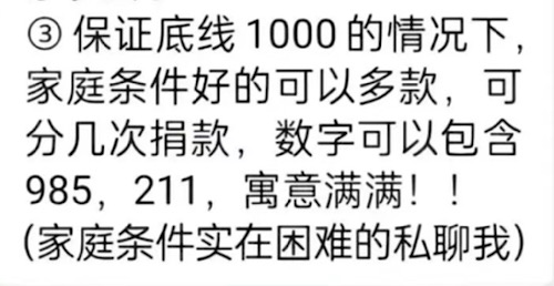 另有網(wǎng)友發(fā)布的截圖顯示,群公告要求在“保證底線1000的情況下,家庭條件好的可多捐,可分幾次捐款,數(shù)字可包含985、211.寓意滿滿”。