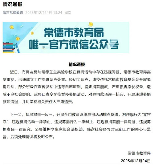 就此事件,常德市教育局于12月24日發(fā)布情況通報。通報稱,經(jīng)初步調(diào)查,該校依托常德市教育基金會開展募捐活動,部分班級在宣傳發(fā)動中違背自愿原則,設(shè)定捐款額度,嚴(yán)重損害家長權(quán)益,造成不良社會影響。教育局已責(zé)令學(xué)校暫停募捐活動,對募捐款項逐一核實,開展違規(guī)募捐款項清退,并對學(xué)校相關(guān)責(zé)任人嚴(yán)肅追責(zé)。