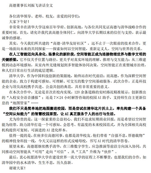 “今天我們助力清華打造的‘友好社區(qū)’,不僅是一次簡單的地圖應用落地,更是嘗試在清華這片沃土上,率先構建一個具備空間認知能力的智慧校園原型。我們希望讓AI真正服務于每個人的出行與生活。”高德董事長劉振飛表示。