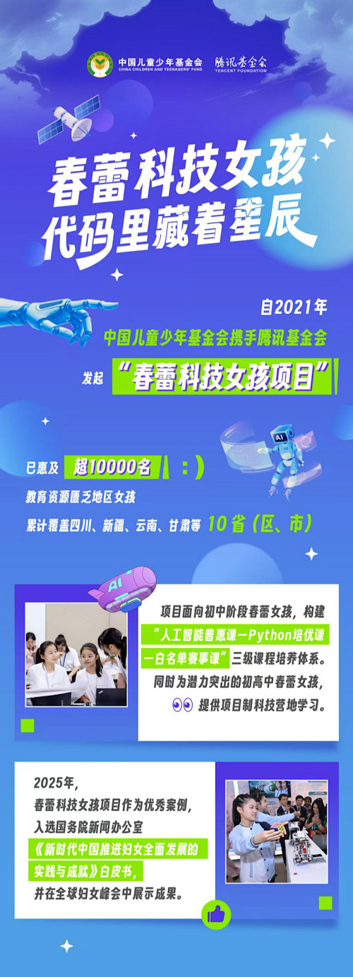 “春蕾科技女孩”項目由中國兒童少年基金會與騰訊公益慈善基金會于2021年共同發(fā)起實施,面向初高中階段的春蕾女孩,圍繞AIGC等前沿科技、文化自信等內容開展科技營地項目制學習,打造初中科技普惠課程+高中研學實踐體系化培養(yǎng)模式,持續(xù)提升女孩科技素養(yǎng)與數字技能,助力她們在科技領域長遠發(fā)展,截至目前,項目已在四川、新疆、云南、貴州等10省(區(qū)市)落地,幫助超萬名春蕾女童打破性別與地域雙重限制,在科技領域綻放獨特光彩。