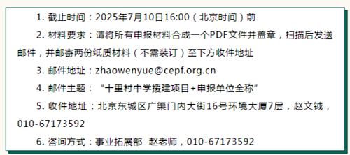 有意者請于 2025年7月11日 18:00 前,將所有申報材料按順序合并為1個PDF 文件,加蓋公章后發(fā)送至郵箱 liuhuiwen@cepf.org.cn,郵件標題格式為 “重慶愛心書屋項目 - XXX 單位(全稱)”。將蓋章版紙質材料寄送至:北京市東城區(qū)廣渠門內大街 16 號環(huán)境大廈 703 室,收件人:劉老師,聯系電話:010-67116117.