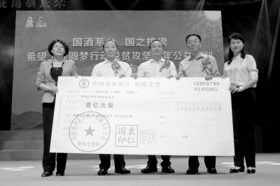 茅臺集團(tuán)董事長袁仁國(左二)和茅臺集團(tuán)黨委書記、總經(jīng)理李保芳(右二)向中國青基會理事長王劍(中)、共青團(tuán)貴州省委書記涂妍(右)和共青團(tuán)河北省委書記宋華英(左)遞交一億元捐贈支票