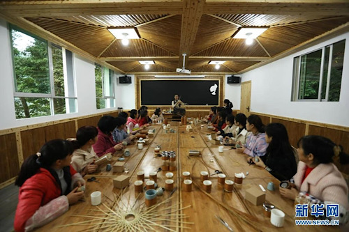 2020年11月5日,在貴州省赤水市大同鎮(zhèn)竹編非遺產(chǎn)學(xué)研基地,楊昌芹(中)在指導(dǎo)學(xué)員學(xué)習(xí)竹編。新華社發(fā)(王長育 攝)