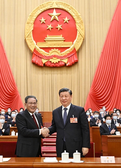 3月11日,十四屆全國人大一次會(huì)議在北京人民大會(huì)堂舉行第四次全體會(huì)議,根據(jù)國家主席習(xí)近平的提名,經(jīng)過投票表決,決定李強(qiáng)為中華人民共和國國務(wù)院總理。這是習(xí)近平同李強(qiáng)握手。新華社記者 李學(xué)仁 攝