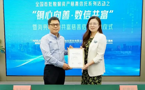 “杭工信•海亮數(shù)智共富慈善信托”在杭州簽約。圖片來源:數(shù)智未來研究院例如,由杭州工商信托股份有限公司、杭州數(shù)據(jù)交易所與浙江海亮股份有限公司共同發(fā)起的“杭工信•海亮數(shù)智共富慈善信托”于9月5日正式簽約,標(biāo)志著全國(guó)首單以數(shù)據(jù)收益權(quán)作為信托財(cái)產(chǎn)的慈善信托項(xiàng)目正式落地。
