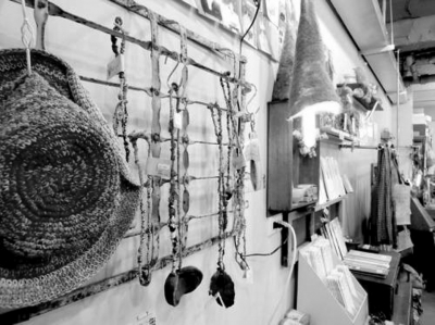 進入“繭裹子”,你會驚訝于它帶有的靈思妙想的創(chuàng)造,也會感嘆于它對于環(huán)保理念的踐行程度。店里招牌是用回收的宜家砧板制作,“繭裹子”LOGO上的字樣是用廢棄的鐵釘排列而成的,還有用上海老房子拆除的舊材料制成的板凳,用老房子廢棄的木門拼成的陳列商品的桌子。而且店里面每樣商品上面的標(biāo)簽,都是從回收的紙袋上剪下手作而成的。