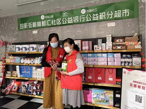 2022年4月16日,志愿者在漢陽區(qū)四新街道梅林都匯社區(qū)“公益積分超市”兌換生活用品,社工則在“公益銀行微信小程序”上掃碼核銷
