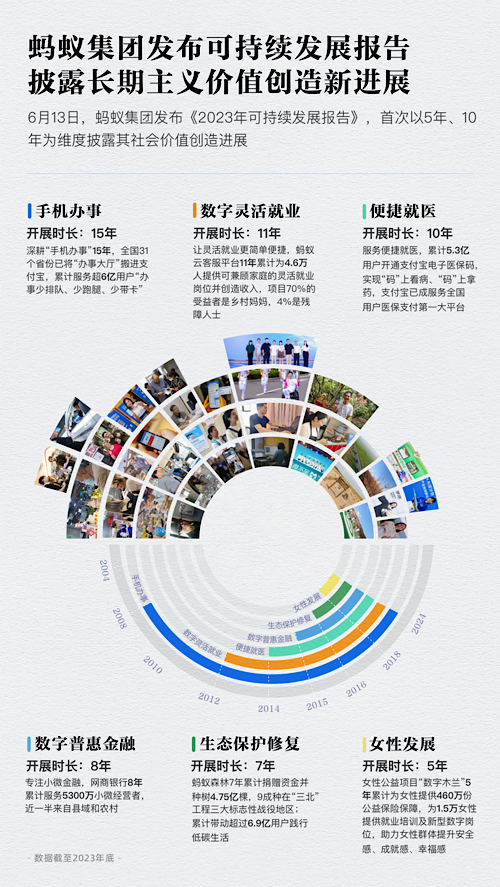 6月13日,螞蟻集團發(fā)布《2023年可持續(xù)發(fā)展報告》,螞蟻集團首次以5年、10年為維度披露其社會價值創(chuàng)造進展: