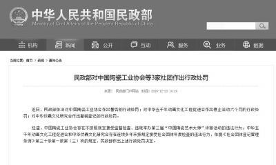 去年7月,中國陶瓷工業(yè)協(xié)會主辦的第三屆“中國陶瓷藝術(shù)大師”評審活動,評選出91名“中國陶瓷藝術(shù)大師”。5個月后,民政部將此次評審活動定性為“違法行為”,并作出警告的行政處罰。