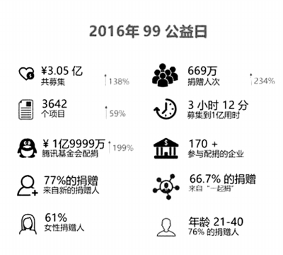 2016年99公益日期間,兒慈會共上線197個項目,支持了60多家NGO伙伴,獲得132萬人次支持,籌得善款約8970萬元。