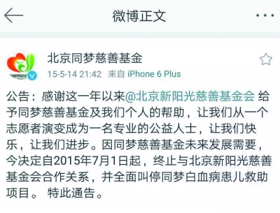 關(guān)于是否對外正式宣布該專項(xiàng)基金與基金會終止合作,新陽光基金會秘書長劉正琛向記者出示了此前同夢慈善基金于2015年5月14日通過官方微博對外宣布終止與基金會合作信息的照片,但并未給出北京新陽光慈善基金會宣布該專項(xiàng)基金停止合作或注銷的相關(guān)信息。而記者在后者的官網(wǎng)及年度工作報(bào)告等資料中均未看到任何關(guān)于終止合作的公告。
