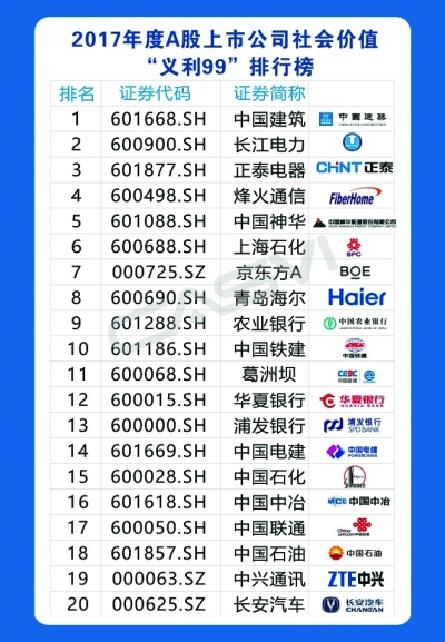2017年12月15日,社會價值投資聯(lián)盟發(fā)布了年度A股上市公司社會價值“義利99”排行榜,99家企業(yè)上榜,圖為前20名企業(yè)