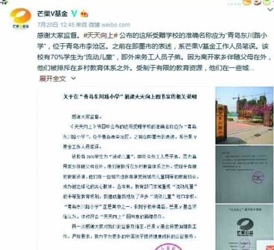 節(jié)目播出后五天,《天天向上》官方微博轉(zhuǎn)發(fā)“芒果V基金”的相關(guān)說明回應(yīng),稱事件的主要原因是芒果V基金工作人員筆誤,捐贈學(xué)校實際位于青島市李滄市,而非即墨市。