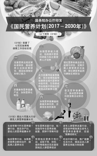 ■ 本報記者 王勇 7月13日,國務院辦公廳發(fā)布了《國民營養(yǎng)計劃(2017—2030年)》。計劃提出了國民營養(yǎng)工作2020年和2030年分別要達到的目標。 到2020年,5歲以下兒童貧血率控制在12%以下;0—6個月嬰兒純母乳喂養(yǎng)率達到50%以上;5歲以下兒童生長遲緩率控制在7%以下;,縮小城鄉(xiāng)學生身高差別…… 到2030年,5歲以下兒童貧血率和孕婦貧血率控制在10%以下;5歲以下兒童生長遲緩率下降至5%以下;0—6個月嬰兒純母乳喂養(yǎng)率在2020年的基礎上提高10%;進一步縮小城鄉(xiāng)學生身高差別…… 為實現這些目標,計劃提出了六項重大行動:生命早期1000天營養(yǎng)健康行動、學生營養(yǎng)改善行動、老年人群營養(yǎng)改善行動、臨床營養(yǎng)行動、貧困地區(qū)營養(yǎng)干預行動、吃動平衡行動。 計劃還提出要充分發(fā)揮營養(yǎng)相關專業(yè)學術團體、行業(yè)協(xié)會等社會組織,以及企業(yè)、個人在實施國民營養(yǎng)計劃中的重要作用,推動社會各方良性互動、有序參與、各盡其責,使人人享有健康福祉。 農村中小學生生長遲緩率 保持在5%以下 為貫徹落實《“健康中國2030”規(guī)劃綱要》,提高國民營養(yǎng)健康水平,《國民營養(yǎng)計劃(2017—2030年)》提出了一系列目標,主要包括: 到2020年,營養(yǎng)法規(guī)標準體系基本完善;營養(yǎng)工作制度基本健全,省、市、縣營養(yǎng)工作體系逐步完善,基層營養(yǎng)工作得到加強;食物營養(yǎng)健康產業(yè)快速發(fā)展,傳統(tǒng)食養(yǎng)服務日益豐富;營養(yǎng)健康信息化水平逐步提升;重點人群營養(yǎng)不良狀況明顯改善,吃動平衡的健康生活方式進一步普及,居民營養(yǎng)健康素養(yǎng)得到明顯提高。實現以下目標: ——降低人群貧血率。5歲以下兒童貧血率控制在12%以下;孕婦貧血率下降至15%以下;老年人群貧血率下降至10%以下;貧困地區(qū)人群貧血率控制在10%以下。 ——孕婦葉酸缺乏率控制在5%以下;0—6個月嬰兒純母乳喂養(yǎng)率達到50%以上;5歲以下兒童生長遲緩率控制在7%以下。 ——農村中小學生的生長遲緩率保持在5%以下,縮小城鄉(xiāng)學生身高差別;學生肥胖率上升趨勢減緩。 ——提高住院病人營養(yǎng)篩查率和營養(yǎng)不良住院病人的營養(yǎng)治療比例。 ——居民營養(yǎng)健康知識知曉率在現有基礎上提高10%。 到2030年,營養(yǎng)法規(guī)標準體系更加健全,營養(yǎng)工作體系更加完善,食物營養(yǎng)健康產業(yè)持續(xù)健康發(fā)展,傳統(tǒng)食養(yǎng)服務更加豐富,“互聯網+營養(yǎng)健康”的智能化應用普遍推廣,居民營養(yǎng)健康素養(yǎng)進一步提高,營養(yǎng)健康狀況顯著改善。實現以下目標: ——進一步降低重點人群貧血率。5歲以下兒童貧血率和孕婦貧血率控制在10%以下。 ——5歲以下兒童生長遲緩率下降至5%以下;0—6個月嬰兒純母乳喂養(yǎng)率在2020年的基礎上提高10%。 ——進一步縮小城鄉(xiāng)學生身高差別;學生肥胖率上升趨勢得到有效控制。 ——進一步提高住院病人營養(yǎng)篩查率和營養(yǎng)不良住院病人的營養(yǎng)治療比例。 ——居民營養(yǎng)健康知識知曉率在2020年的基礎上繼續(xù)提高10%。 ——全國人均每日食鹽攝入量降低20%,居民超重、肥胖的增長速度明顯放緩。 開展貧困地區(qū)營養(yǎng)干預等 多項重大行動 為實現上述目標,計劃提出了多項重大行動,其中有不少是社會組織應該關注和可以參與的。 首先,生命早期1000天營養(yǎng)健康行動,主要包括: 開展孕前和孕產期營養(yǎng)評價與膳食指導。推進縣級以上婦幼保健機構對孕婦進行營養(yǎng)指導,將營養(yǎng)評價和膳食指導納入我國孕前和孕期檢查。開展孕產婦的營養(yǎng)篩查和干預,降低低出生體重兒和巨大兒出生率。建立生命早期1000天營養(yǎng)咨詢平臺。 實施婦幼人群營養(yǎng)干預計劃。繼續(xù)推進農村婦女補充葉酸預防神經管畸形項目,積極引導圍孕期婦女加強含葉酸、鐵在內的多種微量營養(yǎng)素補充,降低孕婦貧血率,預防兒童營養(yǎng)缺乏。在合理膳食基礎上,推動開展孕婦營養(yǎng)包干預項目。 提高母乳喂養(yǎng)率,培養(yǎng)科學喂養(yǎng)行為。進一步完善母乳喂養(yǎng)保障制度,改善母乳喂養(yǎng)環(huán)境,在公共場所和機關、企事業(yè)單位建立母嬰室。研究制定嬰幼兒科學喂養(yǎng)策略,宣傳引導合理輔食喂養(yǎng)。加強對嬰幼兒腹瀉、營養(yǎng)不良病例的監(jiān)測預警,研究制定并實施嬰幼兒食源性疾病(腹瀉等)的防控策略。 其次,學生營養(yǎng)改善行動,主要包括: 指導學生營養(yǎng)就餐。鼓勵地方因地制宜制定滿足不同年齡段在校學生營養(yǎng)需求的食譜指南,引導學生科學營養(yǎng)就餐。制定并實施集體供餐單位營養(yǎng)操作規(guī)范。 學生超重、肥胖干預。開展針對學生的“運動+營養(yǎng)”的體重管理和干預策略,對學生開展均衡膳食和營養(yǎng)宣教,增強學生體育鍛煉。加強對校園及周邊食物售賣的管理。加強對學生超重、肥胖情況的監(jiān)測與評價,分析家庭、學校和社會等影響因素,提出有針對性的綜合干預措施。 開展學生營養(yǎng)健康教育。推動中小學加強營養(yǎng)健康教育。結合不同年齡段學生的特點,開展形式多樣的課內外營養(yǎng)健康教育活動。 再次,老年人群營養(y