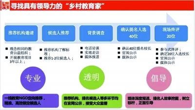 在本屆“馬云鄉(xiāng)村校長計劃”的整個評選過程中,基金會采取了與以往不同的模式。在申報環(huán)節(jié),與“馬云鄉(xiāng)村教師計劃”不同,基金會并未采取全國范圍內(nèi)的個人申報的海選方式,而是由基金會選擇全國的一線教育類公益機(jī)構(gòu),由專業(yè)機(jī)構(gòu)進(jìn)行推薦,每家機(jī)構(gòu)推薦1-2名候選人,基金會項目組對候選人進(jìn)行信息核實(shí)并配合媒體深度報道,確保每個環(huán)節(jié)都公開透明。
