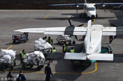 當(dāng)?shù)貢r(shí)間2018年3月17日,尼泊爾盧克拉,尼泊爾航空工作人員將從珠峰地區(qū)收集的垃圾搬上飛機(jī),將運(yùn)往加德滿都回收。每年約有4萬名游客造訪珠峰地區(qū),在當(dāng)?shù)亓粝聰?shù)千公斤的垃圾,對(duì)環(huán)境造成威脅。