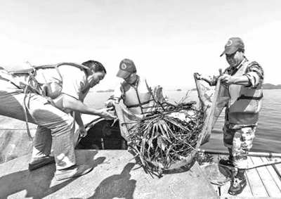 千島湖環(huán)衛(wèi)所發(fā)動(dòng)民間力量全民護(hù)水。2017年,千島湖環(huán)衛(wèi)所及民間公益船隊(duì)共打撈水上垃圾3000多噸,民間護(hù)水志愿者出動(dòng)7000多人次,共同守護(hù)“一湖碧水”。圖為浙江省杭州市淳安縣民間公益船隊(duì)在千島湖湖面巡查,打撈樹枝樹葉等漂浮物。(新華社記者 徐昱/攝)