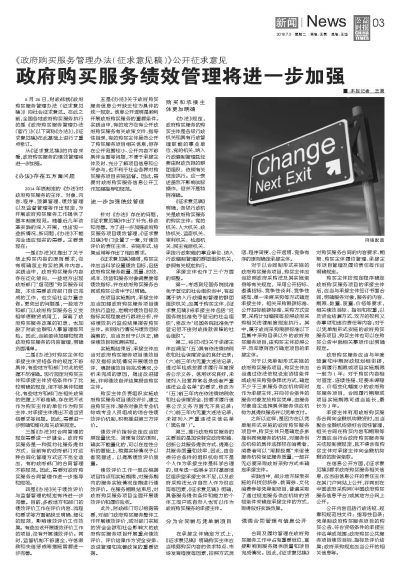 6月,財(cái)政部就《政府購(gòu)買(mǎi)服務(wù)管理辦法(征求意見(jiàn)稿)》向社會(huì)征求意見(jiàn)?!墩髑笠庖?jiàn)稿》在《政府購(gòu)買(mǎi)服務(wù)管理辦法(暫行)》基礎(chǔ)上進(jìn)一步加強(qiáng)了關(guān)于績(jī)效管理的要求。8月,財(cái)政部發(fā)布了《關(guān)于推進(jìn)政府購(gòu)買(mǎi)服務(wù)第三方績(jī)效評(píng)價(jià)工作的指導(dǎo)意見(jiàn)》。政府購(gòu)買(mǎi)服務(wù)的績(jī)效管理將更加科學(xué)有效。 1. 政府購(gòu)買(mǎi)服務(wù)管理辦法即將出臺(tái) 6月26日,財(cái)政部就《政府購(gòu)買(mǎi)服務(wù)管理辦法(征求意見(jiàn)稿)》向社會(huì)征求意見(jiàn)。在此之前,全國(guó)各地政府購(gòu)買(mǎi)服務(wù)執(zhí)行的是《政府購(gòu)買(mǎi)服務(wù)管理辦法(暫行)》(以下簡(jiǎn)稱(chēng)《辦法》)。 2014年底制定的《辦法》對(duì)政府購(gòu)買(mǎi)服務(wù)的主體、對(duì)象、內(nèi)容、程序、預(yù)算管理、績(jī)效管理以及監(jiān)督管理等作出規(guī)定,為開(kāi)展政府購(gòu)買(mǎi)服務(wù)工作提供了基本制度規(guī)范。隨著近幾年改革實(shí)踐的深入開(kāi)展,也出現(xiàn)一些新情況、新問(wèn)題,《辦法》不能完全適應(yīng)現(xiàn)實(shí)的需要。主要表現(xiàn)在: 一是《辦法》僅提出了關(guān)于禁止購(gòu)買(mǎi)內(nèi)容的原則要求,沒(méi)有明確禁止購(gòu)買(mǎi)的具體內(nèi)容。二是《辦法》對(duì)購(gòu)買(mǎi)主體和承接主體資格條件的規(guī)定不夠具體,有些地方和部門(mén)對(duì)此的把握不盡準(zhǔn)確。三是《辦法》對(duì)合同管理的規(guī)定需要進(jìn)一步健全。四是《辦法》關(guān)于績(jī)效評(píng)價(jià)與監(jiān)督管理的規(guī)定有待進(jìn)一步完善。五是《辦法》關(guān)于政府購(gòu)買(mǎi)服務(wù)信息公開(kāi)缺乏較為具體的統(tǒng)一規(guī)定。 針對(duì)《辦法》存在的問(wèn)題,《征求意見(jiàn)稿》作出了補(bǔ)充、修改和完善。為了進(jìn)一步加強(qiáng)政府購(gòu)買(mǎi)服務(wù)項(xiàng)目績(jī)效管理,《征求意見(jiàn)稿》專(zhuān)門(mén)設(shè)置了一章,對(duì)績(jī)效評(píng)價(jià)的責(zé)任主體、實(shí)施形式、結(jié)果運(yùn)用等作出了相應(yīng)要求。 《征求意見(jiàn)稿》強(qiáng)調(diào),購(gòu)買(mǎi)主體應(yīng)當(dāng)科學(xué)設(shè)置績(jī)效目標(biāo),包括政府購(gòu)買(mǎi)服務(wù)數(shù)量、質(zhì)量、時(shí)效、成本、效益和服務(wù)對(duì)象滿(mǎn)意度等績(jī)效指標(biāo),并在政府購(gòu)買(mǎi)服務(wù)合同或購(gòu)買(mǎi)公告中予以明確。 在承接主體確定方式上,《征求意見(jiàn)稿》明確購(gòu)買(mǎi)主體應(yīng)當(dāng)根據(jù)購(gòu)買(mǎi)內(nèi)容的供求特點(diǎn)、市場(chǎng)發(fā)育程度等因素,按照方式靈活、程序簡(jiǎn)便、公開(kāi)透明、競(jìng)爭(zhēng)有序的原則確定承接主體。 2. 財(cái)政部推進(jìn)政府購(gòu)買(mǎi)服務(wù)第三方績(jī)效評(píng)價(jià) 8月,財(cái)政部發(fā)布了《關(guān)于推進(jìn)政府購(gòu)買(mǎi)服務(wù)第三方績(jī)效評(píng)價(jià)工作的指導(dǎo)意見(jiàn)》(以下簡(jiǎn)稱(chēng)《指導(dǎo)意見(jiàn)》)。 財(cái)政部將于2018—2019年組織部分省市開(kāi)展試點(diǎn),通過(guò)試點(diǎn)完善政府購(gòu)買(mǎi)服務(wù)績(jī)效指標(biāo)體系,探索創(chuàng)新評(píng)價(jià)形式、評(píng)價(jià)方法、評(píng)價(jià)路徑,穩(wěn)步推廣第三方績(jī)效評(píng)價(jià)。 《指導(dǎo)意見(jiàn)》明確,綜合考慮地方經(jīng)濟(jì)社會(huì)發(fā)展及評(píng)價(jià)工作開(kāi)展情況等因素,選取天津市、山西省、吉林省、上海市、江蘇省、浙江省、河南省、四川省、貴州省、深圳市等10個(gè)省、直轄市、計(jì)劃單列市開(kāi)展政府購(gòu)買(mǎi)服務(wù)第三方績(jī)效評(píng)價(jià)試點(diǎn)。 政府購(gòu)買(mǎi)服務(wù)第三方績(jī)效評(píng)價(jià)工作究竟該如何實(shí)施?《指導(dǎo)意見(jiàn)》對(duì)相關(guān)主體責(zé)任、評(píng)價(jià)范圍、評(píng)價(jià)機(jī)構(gòu)、指標(biāo)體系、工作開(kāi)展、結(jié)果應(yīng)用、經(jīng)費(fèi)管理、信息公開(kāi)、監(jiān)督管理等均提出了明確要求。 績(jī)效評(píng)價(jià)范圍方面,受益對(duì)象為社會(huì)公眾的政府購(gòu)買(mǎi)公共服務(wù)項(xiàng)目,應(yīng)當(dāng)積極引入第三方機(jī)構(gòu)開(kāi)展績(jī)效評(píng)價(jià)工作,就購(gòu)買(mǎi)服務(wù)行為的經(jīng)濟(jì)性、規(guī)范性、效率性、公平性開(kāi)展評(píng)價(jià)。 要建立健全指標(biāo)體系。編制預(yù)算時(shí)應(yīng)同步合理設(shè)定政府購(gòu)買(mǎi)服務(wù)績(jī)效目標(biāo)及相應(yīng)指標(biāo),作為開(kāi)展政府購(gòu)買(mǎi)服務(wù)績(jī)效評(píng)價(jià)的依據(jù)。指標(biāo)體系要能夠客觀評(píng)價(jià)服務(wù)提供狀況和服務(wù)對(duì)象、相關(guān)群體以及購(gòu)買(mǎi)主體等方面滿(mǎn)意情況,特別是對(duì)服務(wù)對(duì)象滿(mǎn)意度指標(biāo)應(yīng)當(dāng)賦予較大權(quán)重。 評(píng)價(jià)工作開(kāi)展方面,要將績(jī)效管理貫穿政府購(gòu)買(mǎi)服務(wù)全過(guò)程,推動(dòng)績(jī)效目標(biāo)管