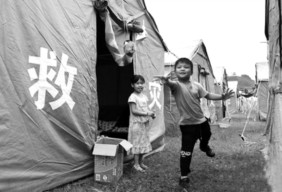 6月19日下午,在當(dāng)?shù)貓F(tuán)組織的協(xié)調(diào)下,在震中長寧縣雙河鎮(zhèn)雙河中學(xué)操場上的臨時(shí)安置點(diǎn),志愿者搭建起了震中第一個(gè)兒童樂園。圖為四川省長寧縣雙河鎮(zhèn)雙河中學(xué)臨時(shí)安置點(diǎn),孩子們在帳篷間玩耍。