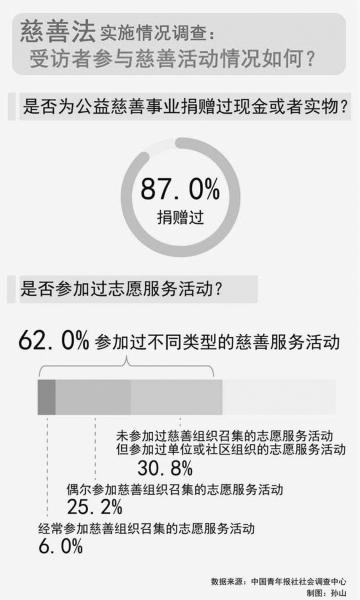 近日,為更好地了解《中華人民共和國慈善法》的實(shí)施情況,中國青年報社社會調(diào)查中心受全國人大有關(guān)機(jī)構(gòu)委托,就慈善法中與公眾關(guān)系密切的相關(guān)內(nèi)容進(jìn)行了問卷調(diào)查。這項(xiàng)調(diào)查在中國青年報社全媒體平臺展開,調(diào)查從2020年8月9日19時40開始,至2020年8月19日22時截止。共回收有效樣本5039個。 調(diào)查顯示,87.0%的受訪者表示,曾為公益慈善事業(yè)捐贈過現(xiàn)金或?qū)嵨铩?2.0%的受訪者參加過不同類型的慈善服務(wù)活動。受訪者對于慈善法的知曉程度還有待提升,83.0%的受訪者表示對慈善法不太了解或完全不了解。 87.0%受訪者曾為公益慈善事業(yè)捐贈過現(xiàn)金或?qū)嵨?/p> 10月15日,十三屆全國人大常委會第二十二次會議聽取了全國人大常委會執(zhí)法檢查組關(guān)于檢查《慈善法》實(shí)施情況的報告。報告指出,慈善法的實(shí)施促進(jìn)了公眾慈善意識普及。 在本次調(diào)查中,87.0%的受訪者表示,曾為公益慈善事業(yè)捐贈過現(xiàn)金或?qū)嵨铩?/p> 62.0%的受訪者參加過不同類型的慈善服務(wù)活動。其中,6.0%的受訪者經(jīng)常參加公益慈善組織召集的志愿服務(wù)活動,25.2%的受訪者偶爾參加,30.8%的受訪者雖未參加過公益慈善組織召集的志愿服務(wù)活動,但參加過單位或者社區(qū)組織的志愿服務(wù)活動。 一名來自湖南的90后留言,自己在大學(xué)期間參與了公益組織的活動,非常認(rèn)同做慈善是一件好事。 雖然公眾的慈善意識在提高,但公眾對慈善法的認(rèn)知和了解還有待進(jìn)一步的提升。 調(diào)查顯示,65.3%的受訪者不知道慈善法,83.0%的受訪者表示對慈善法不太了解或者完全不了解。交互分析發(fā)現(xiàn),00后受訪者知道慈善法的比例更高,博士受訪者了解慈善法的比例更高。 一名來自江蘇的70后留言,自己雖然知道有慈善法這部法律,但并不太了解內(nèi)容,覺得目前法律宣傳還不夠到位。 “感覺沒有很好地利用互聯(lián)網(wǎng)做宣傳。”一名來自天津的90后覺得慈善法的普及宣傳還不夠,她希望可以多利用互聯(lián)網(wǎng)渠道,讓大家以更簡單的方式參與其中。 “慈善法的知曉度不高,可能與這部法律和普通大眾日常生活聯(lián)系沒那么緊密有關(guān)。”北京大學(xué)社會學(xué)博士、深圳大學(xué)管理學(xué)院助理教授章高榮認(rèn)為,提高慈善法的普及可以從兩個方面來進(jìn)行,對于相關(guān)專業(yè)從業(yè)人員而言,可以通過加強(qiáng)培訓(xùn)來實(shí)現(xiàn)。對于公眾來說,可以結(jié)合一些特殊時點(diǎn)來進(jìn)行普法宣傳?!叭绻粋€普通人只是偶爾捐個款,可能不太會特別關(guān)注這部法律。如果可以提升慈善行業(yè)在社會中的作用,增強(qiáng)與個人生活的相關(guān)性,那么隨著慈善組織的發(fā)展,公眾越來越多地參與到慈善中,他們對慈善法的了解也會增強(qiáng)”。 如何應(yīng)對互聯(lián)網(wǎng)衍生的慈善新挑戰(zhàn)? 全國人大常委會執(zhí)法檢查報告表示,慈善法對以網(wǎng)絡(luò)為平臺和媒介進(jìn)行的募捐、捐贈和宣傳進(jìn)行了規(guī)范,主要是將網(wǎng)絡(luò)與廣播、電視、報刊、電信并列作為一種信息傳輸渠道,沒有將其作為一種支付場所和生活場景,對新問題的規(guī)范不足。 2016年以來民政部先后兩批遴選指定共20家互聯(lián)網(wǎng)募捐信息平臺為慈善組織提供募捐信息發(fā)布服務(wù)。網(wǎng)絡(luò)籌款已成為公開募捐的主要途徑。有慈善組織反映,互聯(lián)網(wǎng)公開募捐信息平臺對慈善項(xiàng)目的執(zhí)行成本、管理費(fèi)用等要求比法律法規(guī)更加嚴(yán)格,限制了募捐渠道;個別互聯(lián)網(wǎng)平臺收取委托費(fèi)用且比例過高,影響了實(shí)際籌款效果。 互聯(lián)網(wǎng)應(yīng)用的普及,為公眾參與慈善提供了更為方便、快捷的渠道,但也出現(xiàn)了許多新挑戰(zhàn)。在調(diào)查中,不少受訪者留言提及了互聯(lián)網(wǎng)慈善的相關(guān)問題。 一名來自江蘇的90后留言,她覺得雖然互聯(lián)網(wǎng)提高了慈善的效率,但如果信息透明度降低,則會影響慈善的公信力。 一名來自河北省的90后感覺,在互聯(lián)網(wǎng)平臺上的捐款,存在著去向不明的問題。 山西省一名90后建議,完善慈善法對互聯(lián)網(wǎng)公益慈善事業(yè)的指導(dǎo)作用。 一名來自廣東的90后希望,可以對互聯(lián)網(wǎng)的公益項(xiàng)目有更加嚴(yán)格的審核、事后跟進(jìn)和反饋機(jī)制。 目前互聯(lián)網(wǎng)平臺上的個人求助不屬于慈善募捐、不在慈善法規(guī)制范圍,但是互聯(lián)網(wǎng)平臺個人求助方面存在的問題,也影響了公眾對于慈善事業(yè)的評價。 對此,章高榮表示,可以通過互聯(lián)網(wǎng)相關(guān)的其他法律法規(guī)來進(jìn)行規(guī)范?!皞€人募款行為,本身不屬于慈善法定義的內(nèi)容。但現(xiàn)在網(wǎng)絡(luò)平臺上個人募款非常普遍”。他認(rèn)為,慈善組織可以將個人求助納入到自己的工作范圍內(nèi),從而規(guī)范個人網(wǎng)絡(luò)求助,同時也可以引導(dǎo)公眾,通過慈善組織完成個人求助。“對于慈善組織來說,需要對求助信息進(jìn)行審核,同時整個流程也要符合慈善法的規(guī)范。通過這樣的方式可以讓個人求助更為規(guī)范,創(chuàng)