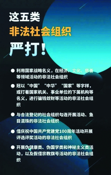 ■ 本報記者 王勇 日前,民政部等多部門聯(lián)合印發(fā)的《關于鏟除非法社會組織滋生土壤凈化社會組織生態(tài)空間的通知》(以下簡稱《通知》),引起社會各方廣泛關注。民政部負責同志就《通知》有關問題答記者問,強調打擊整治非法社會組織是一項系統(tǒng)工程,需要做多方面的工作。 “《通知》的核心精神和內(nèi)容可以概括為‘六不得一提高’,以列舉的方式提出了倡導性要求和禁止性規(guī)范,再一一對應處理措施,可操作性強?!痹撠撠熑藦娬{。 “十四五”開局起步 “絆腳石” 非法社會組織是指未經(jīng)民政部門登記,擅自以社會組織名義開展活動的組織,以及被撤銷登記或吊銷登記證書后繼續(xù)以社會組織名義活動的組織,還包括籌備期間開展籌備以外活動的組織。 許多非法社會組織非常狡猾,絞盡腦汁用各種方式讓人信任其“真實性”和“權威性”,總結起來一般有以下幾種手法: 一是名稱讓人真假難辨。很多非法社會組織往往冠以“中國”“中華”“全國”“世界”等名頭,有的在名稱上與合法登記的全國性社會組織僅一字之差,網(wǎng)頁宣傳上抄襲合法社會組織的官網(wǎng)內(nèi)容,社會公眾難辨真假。 二是活動領域“蹭熱點”。非法社會組織善于打“擦邊球”,往往跟風“軍民融合”“鄉(xiāng)村振興”“疫情防控”等熱點,吸引眼球。 三是組織形式“品種繁多”。非法社會組織有的以“協(xié)會”“促進會”“聯(lián)合會”“基金會”等傳統(tǒng)社會組織形式活動;有的以“委員會”“發(fā)展局”“中心”等類似政府機關和事業(yè)單位的組織形式活動,令人防不勝防。 四是包裝宣傳“高大上”。有些非法社會組織特意在黨政機關辦公地附近或附屬場所租用辦公場地,有的拉攏一些退休黨政干部或社會名人“站臺”“代言”,有的找各種媒體為自己進行宣傳“貼金”,用各種手法增加其“可信度”。 五是用合法外衣做掩護。有的非法社會組織千方百計“投靠”到合法登記的社會組織名下,變身為分支機構;有的與合法社會組織共同開展活動;有的想方設法成為事業(yè)單位的下設機構,魚目混珠。 今年是中國共產(chǎn)黨百年華誕,是“十四五”規(guī)劃開局之年,是開啟全面建設社會主義現(xiàn)代化國家新征程的第一年。“非法社會組織歷來工于‘蹭熱點’,窺伺國際、國內(nèi)環(huán)境中蘊藏的‘商機’,以便牟取非法利益,對此,我們必須警醒。”該負責人強調。 據(jù)該負責人介紹,這次民政部聯(lián)合有關部門,本著“標本兼治”的原則,亮利劍、出重拳,目的就是絕不允許非法社會組織成為“十四五”開局起步的“絆腳石”。 一方面,民政部、中央宣傳部、中央政法委等18個部門將聯(lián)合開展為期3個半月的進一步打擊整治非法社會組織專項行動。3月20日,召開了進一步打擊整治非法社會組織電視電話會議,向全國進行了動員和部署。此次專項行動,是繼2018年民政部、公安部聯(lián)合開展打擊整治非法社會組織專項行動以來的第二次專項行動。相比第一次專項行動,這次行動規(guī)模更廣、參與部門更多、打擊力度更強、措施更嚴厲,必將對非法社會組織形成壓倒性態(tài)勢。 另一方面,民政部聯(lián)合21個部門印發(fā)了這個《通知》。聯(lián)合發(fā)文參與部門之多、涉及面之廣、對策之精準,都是前所未有的,這既說明打擊整治非法社會組織涉及社會方方面面,需要全社會的共同參與,也說明各部門的心是齊的,認識是一致的,這對深入持久地打擊整治非法社會組織必將產(chǎn)生重要推動作用。 鏟除非法社會組織滋生土壤 與合法登記的社會組織相比,非法社會組織飄忽不定,“神出鬼沒”,但非法社會組織并非“不食人間煙火”,它們非常需要宣傳渠道、活動場所、資金來源、網(wǎng)絡營銷平臺以及各色人等的“捧場”,離開了以上條件的支持它們是無法存活的。 因此,《通知》開宗明義,著眼點是鏟除非法社會組織賴以生存的土壤,體現(xiàn)了系統(tǒng)治理、依法治理、綜合治理、源頭治理的思維,找準了非法社會組織的“七寸”。 比如,如果大家不去參加非法社會組織開展的活動,對非法社會組織頒發(fā)的獎牌、證書等不感興趣、不“知假買假”,非法社會組織就沒有了騙錢斂財?shù)氖袌?;新聞媒體在宣傳報道社會組織及人員的活動時,若事先“驗明正身”,不為非法社會組織背書,非法社會組織就無處擴大其影響力;如果黨員干部慎友慎獨慎微,隨時隨地牢記黨紀國法,依法依規(guī)參加社會組織活動,非法社會組織唬弄公眾的“權威背景”就會灰飛煙滅;如果各種公共活動場所不“唯利是圖”,特別是一些標志性的會議場館若不為非法社會組織提供“活動樂園”,非法社會組織就沒有了表演的“舞臺”等。 因此,打擊整治非法社會組織政府部門有責,社會方方面面也都有責、有戒,只有社會方方面面的力量都來共同參與,才可能真正實現(xiàn)《通知》提出的鏟除非法社會組織滋生土壤的目標。 《通知》的核心精神和內(nèi)容可以概括為“六不得一提高”,以列舉的方式提出了倡導性要求和禁止性規(guī)范,再一一對應處理措施,可操作性強。 “六不得一提高”基本涵蓋了非法社會組織開展活動所需的必要條件、必要支撐和養(yǎng)分來源,從某種意義上說,這就是打擊整治非法社會組