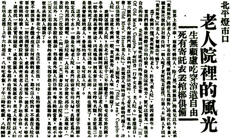 20世紀(jì)30年代,由于養(yǎng)老金和退休制度尚未普遍建立、戰(zhàn)爭及災(zāi)害頻繁,北平市老年貧民的流離失所、孤苦無依逐漸成為一個(gè)社會(huì)問題。如果說以往對于老年貧民的社會(huì)救濟(jì)帶著濃厚的“施惠”“憐民”色彩,那么20世紀(jì)30年代的養(yǎng)老救濟(jì)則開始具備一定的政府責(zé)任意識(shí)。北平市社會(huì)局救濟(jì)院與民間力量發(fā)起的各種養(yǎng)老院所相輔相成,成為由傳統(tǒng)社會(huì)向現(xiàn)代福利社會(huì)轉(zhuǎn)型過程中社會(huì)養(yǎng)老救濟(jì)實(shí)踐不可或缺的參與主體。盡管由于受到社會(huì)歷史條件的局限,這一時(shí)期的養(yǎng)老救濟(jì)事業(yè)還存在著種種缺陷,但其對維持社會(huì)秩序、保障戰(zhàn)亂時(shí)的民生還是有一定的促進(jìn)作用。 官辦救濟(jì)院成立殘老組 與此前主要以民間力量興辦的善堂善會(huì)為主的救濟(jì)設(shè)施構(gòu)成相比,這一時(shí)期由北平市政府主導(dǎo)的救濟(jì)設(shè)施有所增多,同時(shí)面向孤寡老人和殘疾人等社會(huì)弱勢群體的救濟(jì)設(shè)施也開始趨于制度化。 一、殘老組及其養(yǎng)老設(shè)施 1934年6月1日,經(jīng)北平市政府批準(zhǔn),由原第一救濟(jì)院、第二救濟(jì)院、婦女救濟(jì)院、第一習(xí)藝工廠、第二習(xí)藝工廠、乞丐收容所等處改組成立北平市社會(huì)局救濟(jì)院,院址設(shè)于宣外教子胡同前第一救濟(jì)院舊址,由龔齊振任院長。其下設(shè)工務(wù)股、事務(wù)股、營業(yè)股,統(tǒng)一管理北京社會(huì)救助事務(wù),成為北平市政府救濟(jì)機(jī)關(guān)正式建立的標(biāo)志。1934年8月頒布的《北平市社會(huì)局救濟(jì)院章程》規(guī)定了救濟(jì)院救濟(jì)對象,即市內(nèi)貧苦殘老及無依之男女兒童暨不愿為娼之妓女與被虐待之婦孺等。同時(shí),救濟(jì)院將前乞丐收容所改為殘老組和感化組,“以原來之第一救濟(jì)院改為北平市社會(huì)局救濟(jì)總所,附設(shè)收容部,收容部下之感化、殘老兩組,仍設(shè)燕翅樓乞丐收容所原址”,提出“其殘老者養(yǎng)之”,從而與其他救濟(jì)機(jī)構(gòu)得以區(qū)分開來,管理開始趨于規(guī)范。 殘老組收養(yǎng)的老人,或無子女家人,或身體孱弱。為充實(shí)、方便老年人的生活,救濟(jì)院內(nèi)設(shè)教室、工作室、游戲場、寢室、食堂、浴室等生活設(shè)施。衣物上,收容老人衣著以蔽體、保暖、整潔為主。凡收容者,每年發(fā)給單、棉衣各一套,棉鞋、棉被各一雙(套),棉襪一雙;食物層面,則以能適合老年人咀嚼、果腹的清潔食物為主,并注意個(gè)別的營養(yǎng)。早餐有小米粥,午、晚兩餐為玉米面窩頭,佐以菜湯、咸菜。每周一、三、五早餐為白面饅頭,逢年節(jié)增肉食一餐?;疾≌呖梢源竺?、白面調(diào)攝。與此同時(shí),除了涵蓋衣和食的“養(yǎng)”,“醫(yī)”也是老年救濟(jì)必不可少的要素。救濟(jì)院設(shè)有養(yǎng)病室,“每春夏兩季,為全體收容人員預(yù)防白喉、猩紅熱、霍亂等病注射,其有患重病及傳染者,分別送入市立、中央、協(xié)和、傳染等醫(yī)院免費(fèi)診治”。此外,《北平市社會(huì)局救濟(jì)院章程》第二十一條規(guī)定,收容人死亡,由院通知其家屬備棺承領(lǐng);其無家屬者,由院棺殮抬埋?!半S時(shí)電知第一股,然后由該股函請地方法院檢察處派員檢驗(yàn),發(fā)給執(zhí)照,購備棺木,飭役掩埋于本院墓地,樹立石碣”。 二、收養(yǎng)程序 查閱北京市檔案館現(xiàn)存資料可以發(fā)現(xiàn),孤苦無依的老年人經(jīng)由“社會(huì)局票交收容”“各區(qū)屬函送”“慈善團(tuán)體介紹”“自投請求救濟(jì)”“家屬送請教養(yǎng)”五種渠道才可以進(jìn)入社會(huì)局救濟(jì)院。在救濟(jì)收容程序上已具備了現(xiàn)代養(yǎng)老機(jī)構(gòu)的特征和功能。 從北京市檔案館查閱的老年救濟(jì)申請書及批復(fù)的公函件材料來看,1938年1月至12月期間,被收容的老人主要以女性為主,年齡分布最低者是50歲,最長者為80歲?!白酝墩埱缶葷?jì)”者由請投者自行填寫申請書,申請內(nèi)容與實(shí)際情況相符并由社會(huì)局派出巡官核驗(yàn)合格后才能入救濟(jì)院。例如,巡官楊永志奉派調(diào)查崔董氏呈請赴救濟(jì)院收養(yǎng)一案,“遵即赴西城成方街西口外百子胡同五號(hào)系崔董氏之內(nèi)侄董乃溫之家寄居,調(diào)查該氏確系年老貧寒無力生活,情愿入院以求生活舖(鋪)保,亦核對相符理合呈報(bào)”。“各區(qū)屬函送”則由警察局發(fā)送公函致社會(huì)局轉(zhuǎn)交救濟(jì)院,“內(nèi)一區(qū)警察署函送關(guān)(關(guān))田氏年老無依請安置一案到局,訉據(jù)該氏供稱孤身一人,僅有外孫女婿英姓住抽屜胡同曾供給伊生活?,F(xiàn)其停止供給無所依附,請安置?!逼渌樾卧诖瞬辉儋樖?。 三、“教養(yǎng)并施,老有所安”的管理方式 一方面,“救人救徹”這一救助理念開始在政府行動(dòng)中得到一定貫徹而非局限于以往單純發(fā)放衣物、貸款及開設(shè)粥廠和暖廠等此類臨時(shí)性的救助行動(dòng)。如提出“救濟(jì)殘老,并不在提供衣食,使有所終,就算盡了最大的義務(wù),乃是如何使‘殘而不廢’‘老有所安’”等等。 另一方面則是由過去的“重養(yǎng)輕教”逐漸轉(z