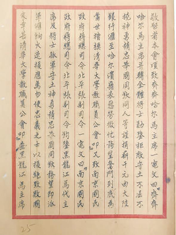 1931年,日本悍然發(fā)動(dòng)九一八事變,中國(guó)人民不屈不撓的局部抗戰(zhàn),揭開了世界反法西斯戰(zhàn)爭(zhēng)的序幕。作為中國(guó)武裝抗日的“第一槍”,江橋抗戰(zhàn)宛如一聲驚雷,在白山黑水間激民族之義憤,燃滿腔之熱血。北平各界同仇敵愾,通過聲援、募捐等方式,表達(dá)對(duì)抗日志士的支持和守土衛(wèi)國(guó)的決心。 臨危受命江橋迎戰(zhàn)關(guān)東軍 初夏的清華園,萬(wàn)物蔥蘢、水木禽鳴,荷塘漣漪一圈圈蕩開。禮堂前,“行勝于言”的石刻在陽(yáng)光下熠熠生輝。 正值周末,入校游學(xué)的青少年絡(luò)繹不絕,在標(biāo)志美景前競(jìng)相留影。風(fēng)華正茂的學(xué)子騎著車經(jīng)過,衣角飄動(dòng),聚焦了人們欽羨的目光。 近百年前,以清華為代表的北平高校師生,同樣以實(shí)際行動(dòng),成為全民抗戰(zhàn)意識(shí)的引領(lǐng)者,正是“行勝于言”的無聲寫照。 1931年,九一八事變爆發(fā)后,日本侵略軍一周內(nèi)相繼侵占遼、吉兩省主要城市,并圖謀進(jìn)犯黑龍江省。黑河警備司令兼步兵第3旅旅長(zhǎng)馬占山臨危受命,主持黑龍江軍政。 “馬占山在嫩江北岸至昂昂溪之間,構(gòu)筑了三道防線。11月3日,日軍兩列鐵甲車開赴嫩江橋,日軍飛機(jī)向中國(guó)軍隊(duì)投擲炸彈?!北本┦袡n案館展陳處副處長(zhǎng)劉靜的講述,令人感受到當(dāng)時(shí)戰(zhàn)況之激烈?!皷|北氣溫已低至嚴(yán)寒,馬占山率領(lǐng)愛國(guó)官兵,以落后的武器、簡(jiǎn)陋的裝備,迎戰(zhàn)擁有飛機(jī)、大炮、坦克的日本關(guān)東軍,喊殺聲、刺刀撞擊聲震蕩山野……半個(gè)月的時(shí)間,抵擋了日軍一波接一波的攻擊?!?br> “男兒抗日死沙場(chǎng),青史垂名姓字香。”江橋抗戰(zhàn)的消息傳到北平后,愛國(guó)學(xué)子熱血沸騰,紛紛請(qǐng)纓要求北上抗日。與此同時(shí),北平各界慷慨解囊,為抗日將士募集善款。其中清華大學(xué)發(fā)揮了先鋒作用,該校教職員公會(huì)對(duì)日委員會(huì)捐薪千元,緊接著,由學(xué)生自治會(huì)迅速組織全校募捐活動(dòng)。 慷慨解囊為將士募集善款 不僅自發(fā)籌措善款,清華大學(xué)教職員公會(huì)對(duì)日委員會(huì)還發(fā)函致北平大學(xué)工學(xué)院,邀對(duì)方對(duì)馬占山進(jìn)行一致聲援。 很快,北平大學(xué)工學(xué)院也發(fā)出募捐慰勞馬占山及諸將士的啟事。劉靜展開這份1931年11月27日的史料,其上載明“當(dāng)此雪地冰天,前方愛國(guó)將士斷頭折臂,努力為國(guó)家爭(zhēng)存亡之際,吾輩身在后方,未能先期赴國(guó)難,自當(dāng)各盡職責(zé),以表救國(guó)之意……”字里行間,盡顯高校青年的報(bào)國(guó)情懷。 學(xué)界之外,各界群眾也自發(fā)組織慰問團(tuán)、后援會(huì),捐款捐物,全力支持。劉靜介紹,例如東北民眾救國(guó)會(huì),爭(zhēng)取張學(xué)良以及國(guó)內(nèi)各界人士、海外僑胞的資助,開展募捐和“義賣”,發(fā)行“愛國(guó)獎(jiǎng)券”等,給黑龍江軍民以極大的支持。 一封封書信、電報(bào),記錄下這段波瀾壯闊的歷史。1932年1月4日的《國(guó)立清華大學(xué)校刊》上,登載馬占山將軍給清華大學(xué)的復(fù)電,稱:“承惠巨款,益勵(lì)初衷。謹(jǐn)率部曲遙致謝忱?!倍盏狡浇?qū)W術(shù)團(tuán)體對(duì)日聯(lián)合會(huì)發(fā)來的電報(bào)后,馬占山更回復(fù),“占山忝屬軍人,尤其責(zé)無旁貸,茍一息之尚存,豈慮孤軍之苦戰(zhàn)?!辩H鏘有力的表達(dá),書就這位民族英雄的氣節(jié)風(fēng)骨,也掀開軍民同仇敵愾,保家衛(wèi)國(guó)的篇章。 奔走宣傳直面“最殘酷時(shí)代” 江橋抗戰(zhàn)的壯舉震動(dòng)海內(nèi)外,除捐款捐物,北平各界還廣泛發(fā)起宣傳活動(dòng)。其中北平師范大學(xué)(現(xiàn)北京師范大學(xué)前身)師生表現(xiàn)活躍,組織了國(guó)立北平師范大學(xué)教職員對(duì)日外交后援會(huì)(后改稱平津?qū)W術(shù)團(tuán)體對(duì)日聯(lián)合會(huì)師大分會(huì))、北平師范大學(xué)抗日救國(guó)會(huì)等團(tuán)體,分析抗戰(zhàn)形勢(shì),揭露日本暴行。 如今的北京師范大學(xué),地處車水馬龍的北三環(huán)旁,徜徉校園,傍晚的風(fēng)攜來芬芳花香,耳畔蕩起廣播悠揚(yáng)的樂曲。正是拍攝畢業(yè)照的時(shí)節(jié),意氣風(fēng)發(fā)的年輕人三三兩兩,在古色古香的教學(xué)樓、京師學(xué)堂、校訓(xùn)石碑前,定格下青春的光影。 當(dāng)年,也是這樣年紀(jì)相仿的學(xué)子們,心懷大義,為民族存亡奔走呼號(hào)。據(jù)北師大校史研究室提供的資料,1931年10月26日,該校學(xué)生抗日救國(guó)會(huì)宣傳隊(duì),曾赴長(zhǎng)辛店機(jī)車廠演講抗日救國(guó),并散發(fā)《為日本帝國(guó)主義占領(lǐng)東三省告工友書》。 此外,北平師范大學(xué)抗日救國(guó)會(huì)還創(chuàng)辦了《抗日周刊》,北京市檔案館所藏第二期,出版于1931年11月2日。末尾征稿啟事疾呼:人類最殘酷的時(shí)代已經(jīng)降臨到我們面前了!這種“殘酷”“無理性”“暴戾”,逼迫著我們不得不負(fù)起這種重大的使命去奮斗,去拼命,去推倒一切的人壓迫人的禽獸行為!并號(hào)召同學(xué)們努力投稿,“戰(zhàn)勝一切的障礙,充實(shí)抗日的內(nèi)容?!?br> 劉靜介紹,北平各界的全力支持,給了馬占山將軍抗戰(zh