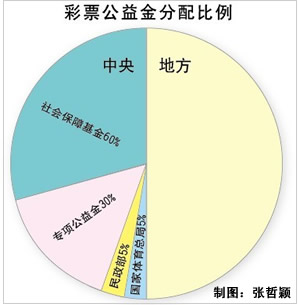 根據(jù)財(cái)政部規(guī)定,中央集中的彩票公益金,在社會(huì)保障基金、專項(xiàng)公益金、民政部和國家體育總局之間,按60%、30%、5%和5%的比例分配。